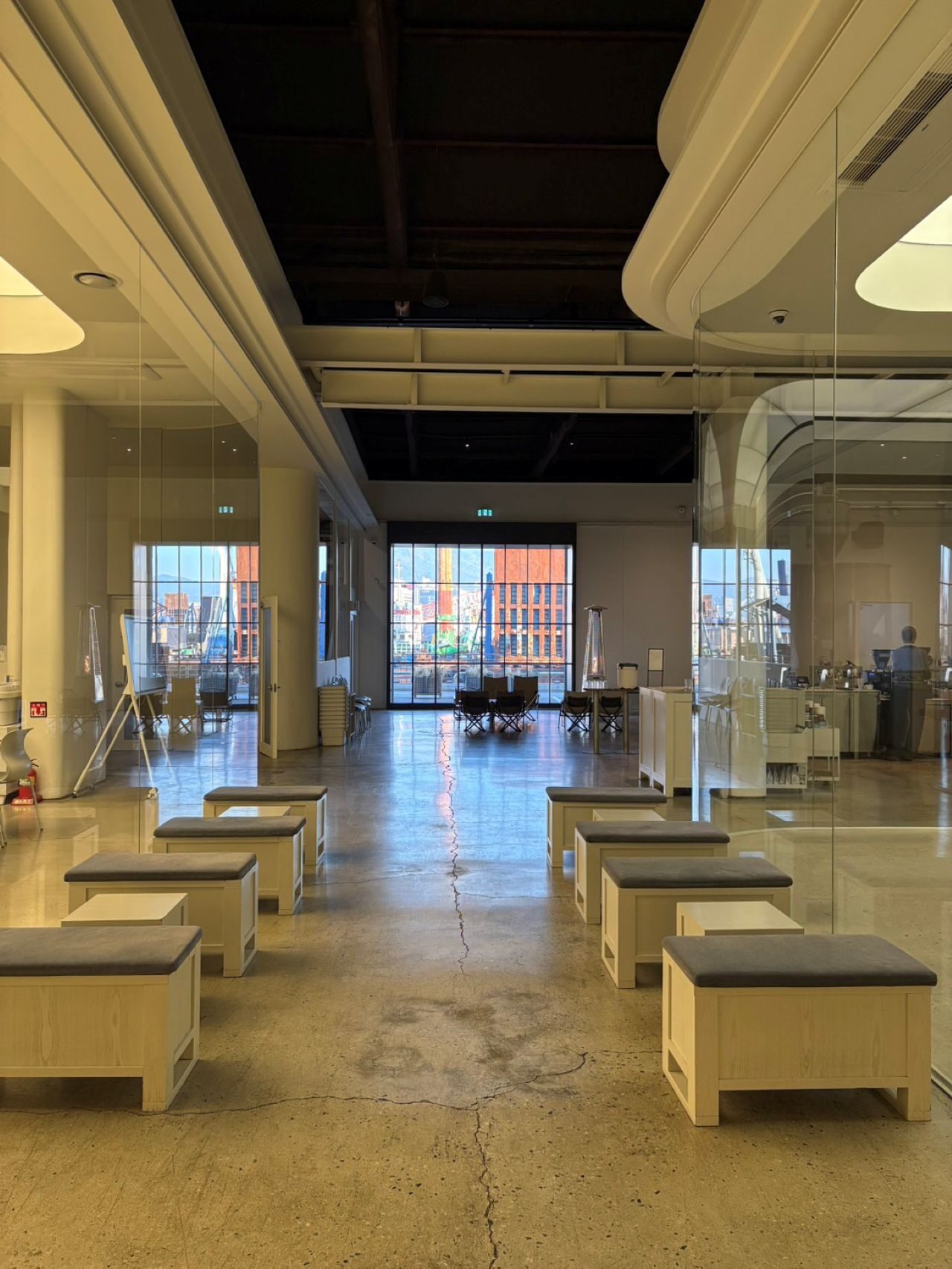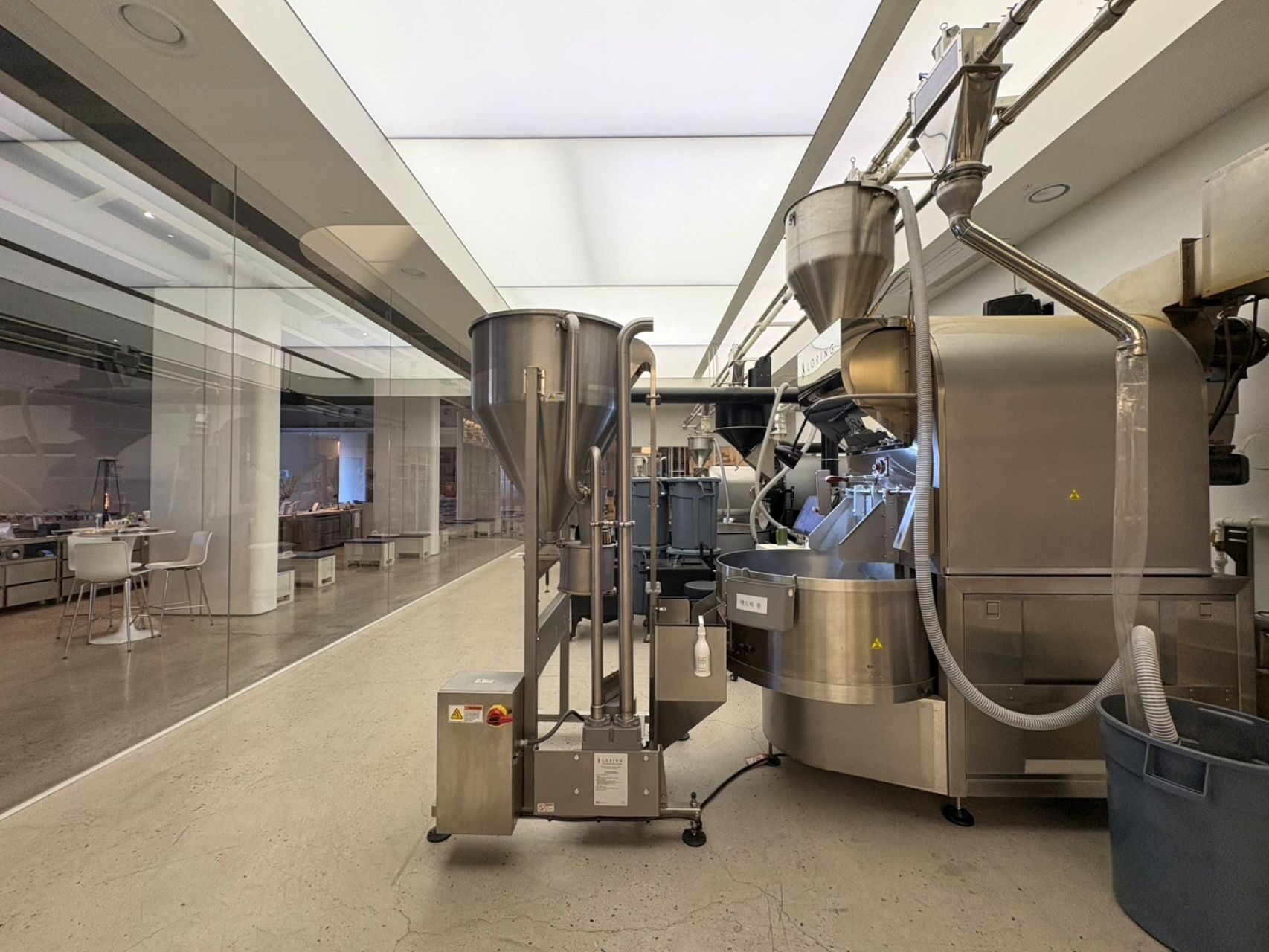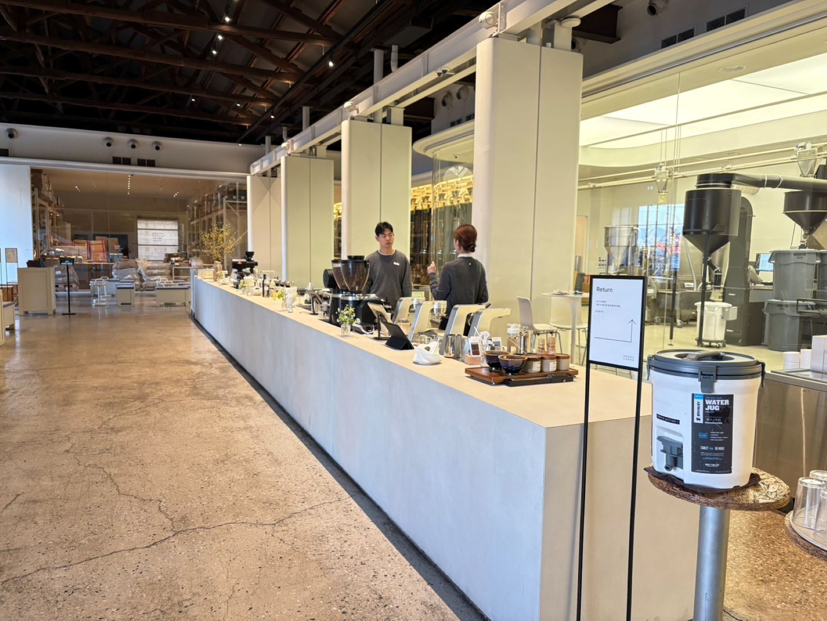 カフェ市場世界3位の韓国に来ると必然的にコーヒーを飲む機会が増えます。釜山港の倉庫を改装したMomos Coffee 影島店に行きました。日本でもONOMICHI U2などの倉庫活用事例がありますが、この特徴は焙煎機から物流、洒落たオフィスや商品のショールームまで、全機能を倉庫内で完結していることです。新築のラ コリーナ近江八幡に対して、古い倉庫を使ったことで、天井には木の構造が見え、より高い洗練を感じます。製造工程やバック部門を見せると言うよりも、工場の中に客席がある、いわばレストランにおけるシェフズテーブルのような感覚です。日本でもファクトリーパークが流行った時期がありますが、より強固な顧客接点を築く、こうした取り組みは、日本でも進めるべきだと感じます。つなぎを着た製造部門の従業員の動線と客動線がぶつかることで、生産から消費というバリューチェーンに参加しているリアリティが迫ってきます。