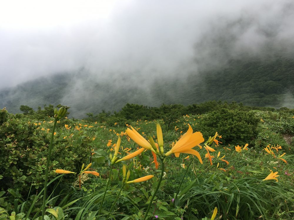 昨日の新甲子温泉は日中の気温が20度を下回り、涼しいというよりは肌寒い一日でした。今朝は晴れの予報でしたので、宿から車で30分ほどの大峠から、流石山(1,812m)、大倉山(1,885m)、三倉山(1,888m)の美しい尾根を、週末のトレイルツアーとは逆方向に縦走することにしました。このルートなら稜線にすぐ上がれ、最初のピークである流石山(1,812m)までは駐車場から1時間10分ほどです。標高1,800mクラスの美しい眺めの広がる長大な尾根は今がニッコウキスゲの見ごろで、人の少ないこのルートは縦走のいいとこ取りができます。三倉山までの往復は14.26km、所要時間は3時間33分、累積標高は975mと程よい運動です。