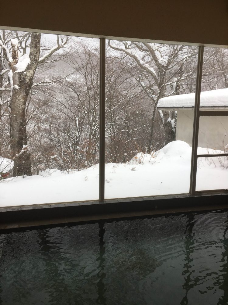 今朝も雪が降り続き、春までこの雪は消えないでしょう。積雪は駐車場で60cmほどあります。写真は温泉浴場から見た景色ですが、離れの屋根にも30cm以上の積雪があります。