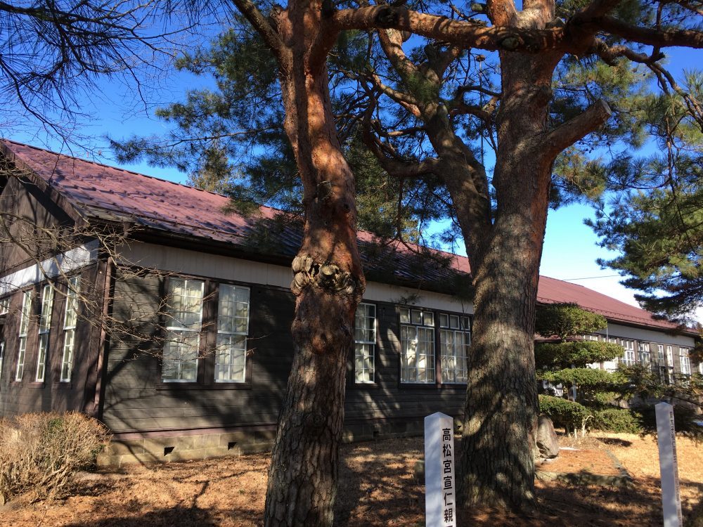 西郷村の歴史で有名なのは旧陸軍の軍馬補充部です。白河支部は明治30年(1897年)に西郷村小田倉に設置されました。現在は西郷村歴史民俗資料館となる写真の建物は、昭和10年(1935年)に軍馬補充部白河支部事務所として建設されたものです。白河支部は軍馬補充部支部の中で最も東京に近いため、天皇や皇室が訪れ、写真右手の松は皇太子時代の昭和天皇が大正5年(1916年)に訪れ植えたものです。