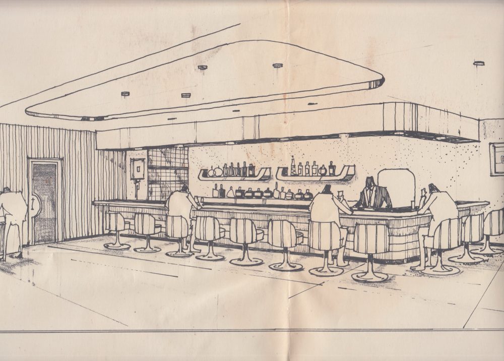 昨日はフロントの清掃をしたついでに古い書類の整理をしました。1972年5月の、当時は「ホテル甲雲」と称していた時代の増築工事に際して書かれたバーのパースが見つかりました。昨年末まで倉庫となっていたこの部屋にはパースにある、昭和の時代を感じさせるバーカウンターが今も残っています。この部屋は那須連山の眺めがよく温泉浴場に隣接していることから、いずれは露天風呂でも作りたいと考えています。