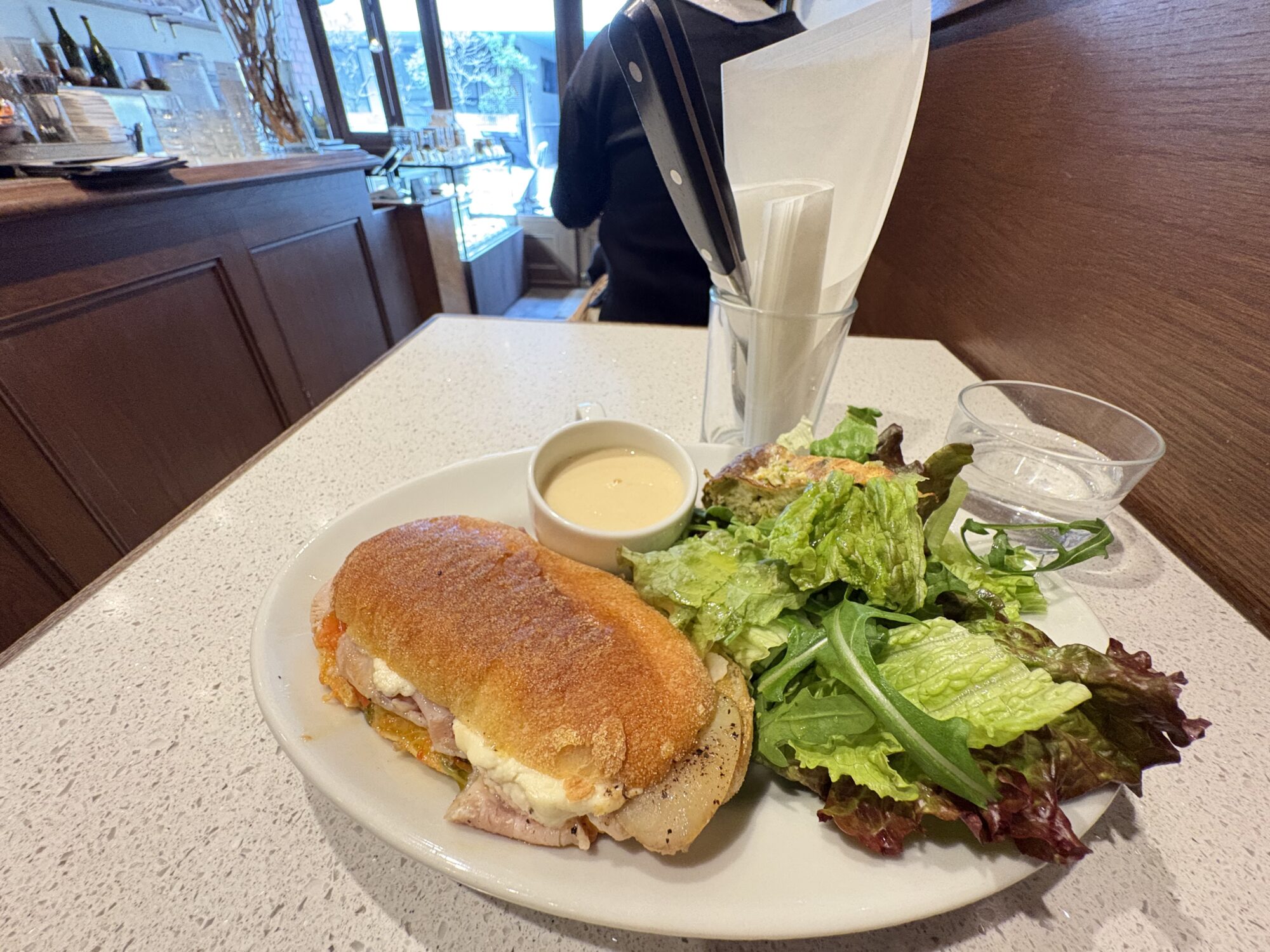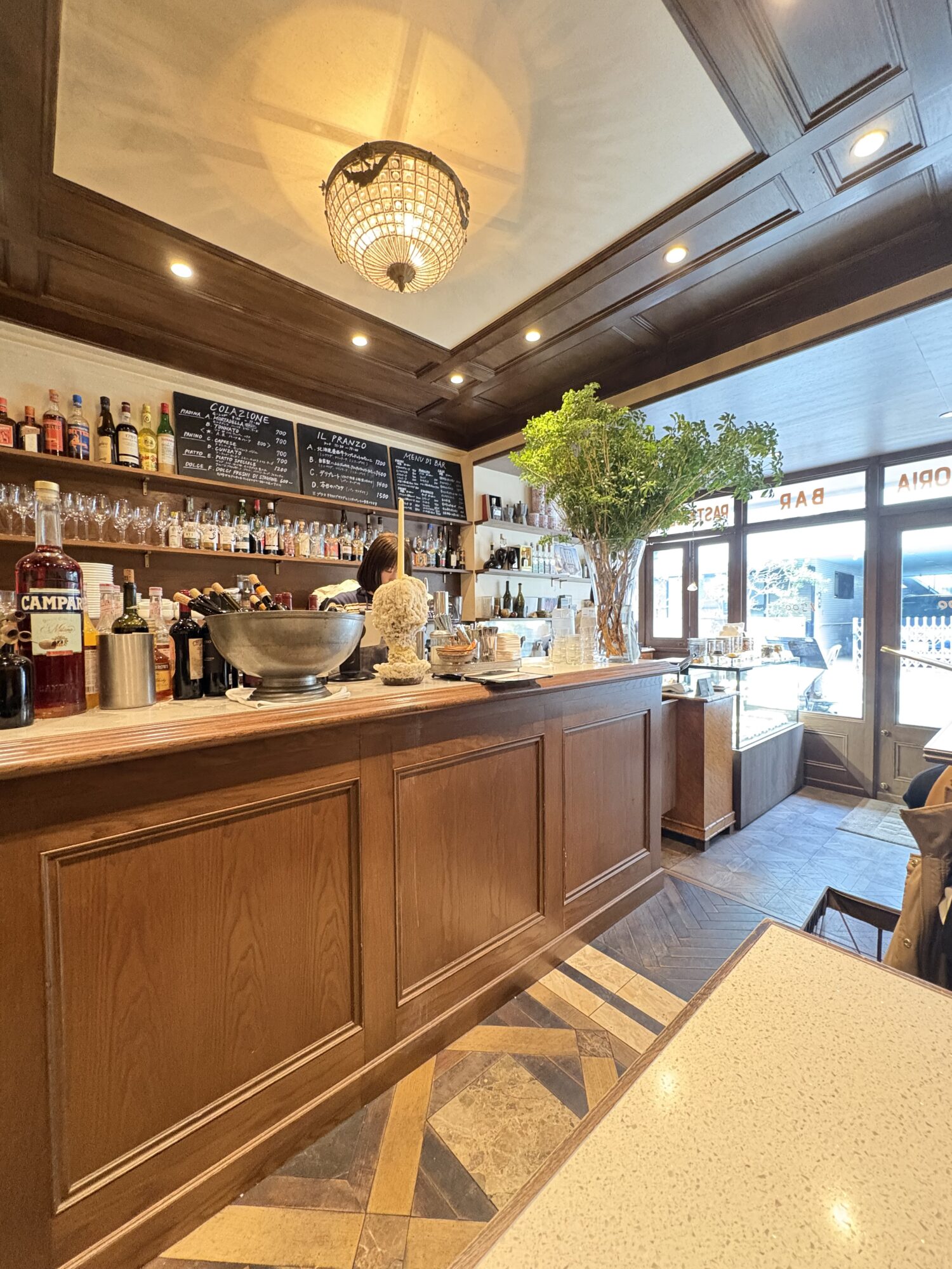 代々木八幡のミレチンクエチェントに行きました。異国情緒漂うレンガ造りの重厚な外観が、以前から気になっていた店です。ミッドセンチュリーの家具や温かみのある木材を組み合わせた店内も、ヴィンテージかつスタイリッシュです。3.5mほどの狭い間口の店は、1階はスタンディングメインのウッドカウンターを構えたバールと、菓子類を販売するパスティッチェリア、2、3階はトラットリアという構成です。オニオンのポタージュや冷製キッシュも味わい深いのですが、絶妙な焼き加減のパニーニはほどよい油分もあって病みつきになりそうです。狭いバーカウンターのなかで作ることができ、ジャンクフードになりかねない日常食のパニーニに上質感を与えながら、ホテルクオリティで提供するあたりは、単品勝負の宿の朝食を考える上で参考になります。