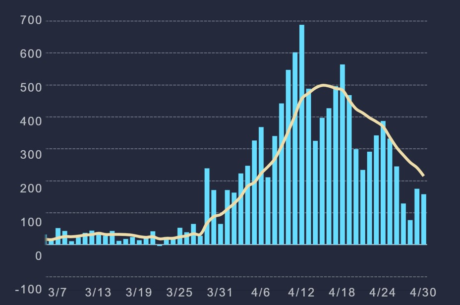 大気汚染が深刻な都市ランキングワースト1位のインド北部から200km離れたヒマラヤ山脈が数十年ぶりに見えたと報道されます。世界中で大気汚染が改善されることは素晴らしいことですが、一方で経済が衰退すれば元も子もなく、感染終息と経済のトレードオフという難しい岐路に世界は立っていると思います。エヌエヌ生命保険の調査では5月末までしか資金が持たない中小企業が45%、6月末までは60%に及ぶとされ、壊滅的な被害を受けた外食、宿泊、航空産業などは深刻です。一ヶ月ほど前に発表された東京都の実効再生産数の1.7は想定の2.5より低く、患者数の移動平均線は2週間前にピークアウトしています。日本政府による渡航制限の遅れが人命を奪うなら、緊急事態宣言の延長も経済的な死者を出します。自粛を徹底しないとより深刻な第二波が来るという脅しが全てに優先する今の政府を見ていると、コンプライアンスは全てに優先すると叫び企業から活力を奪ってしまった経営者の姿とだぶります。緊急事態宣言を続けるなら病院経営をも破壊し経済的な理由から医療崩壊が起こると思います。