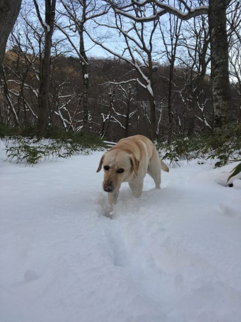 今朝の新甲子温泉は快晴です。3時には除雪車が除雪をはじめその唸り声で目が覚めました。雪に快晴の青空がまぶしく映ります。ラブラドールと阿武隈源流に行くとトレイルには20cmから30cmの積雪があり、早くも厳冬期の風情です。雪のトレイルを歩くと満たされた気持ちになります。幸せという評価や解釈を加えることなく、直接的に「生きている」という充足感が生まれます。