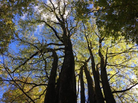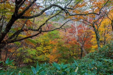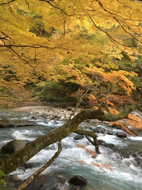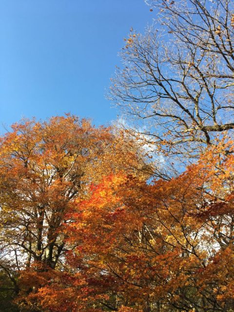 今朝の新甲子温泉は台風一過の青空が広がっています。紅葉していた木々の多くは強風で葉を落としました。阿武隈渓谷から吹き上げる風で落ち葉が蝶のように舞います。温泉の前にブナの大木が2本ありますが、那須連山側の風をまともに受ける木はほとんど葉を散らしているのに、もう一方は葉を茂らせています。