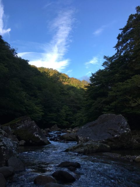 今朝の新甲子温泉は、すっかり秋らしくなった森に太陽が差し込みます。ブナ原生林が広がる源流の遊歩道は、毎日来ているのに発見があり、表情を変える神秘の森です。巨大な楢の木が巨岩を抱いた場所はぼくにとってのパワースポットです。ここに佇み澄んだ清流を眺めていると、自分がこれまで積み重ねてきたことやこだわりなどの執着はどうでもよくなります。わずか2kmに満たない散歩道ですが、ぼくにとっては一日を始めるリトリートです。
