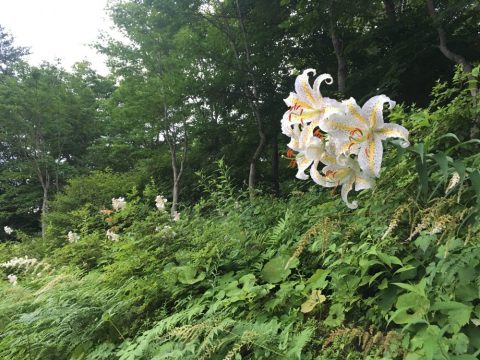 今朝の新甲子温泉は曇天ながら雲が薄いのか明るい空です。宿の外に出るとヤマユリの甘い香りが漂います。江森山との間にある阿武隈川の狭い渓谷に雲海が立ち込め幻想的です。朝霧の立ち込める森に入るとヒグラシの音色と森を抜ける風が心地よく幻想性を高めます。
