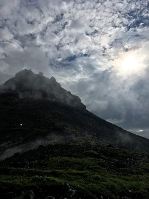 今朝の新甲子温泉も雨だったのですが、6時頃には雲間から青空が姿を見せるようになり、車で宿から25分の峠の茶屋駐車場からラブラドールと茶臼岳(1,915m)に登りました。ロープウェイを使わずとも山頂まではスピードハイクのペースなら牛首を経由しても1時間、下りは峰の茶屋に直接降りるルートだと駐車場まで30分ほどと、朝の散歩がわりになります。往復1時間半の散歩道ですが、百名山だけあって高山気分を味わえます。