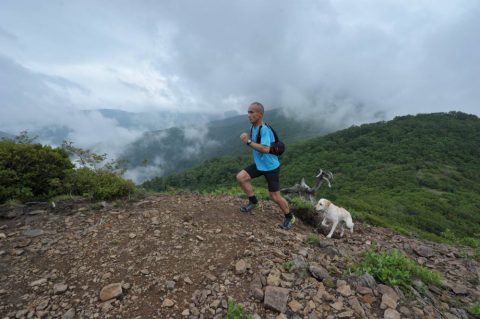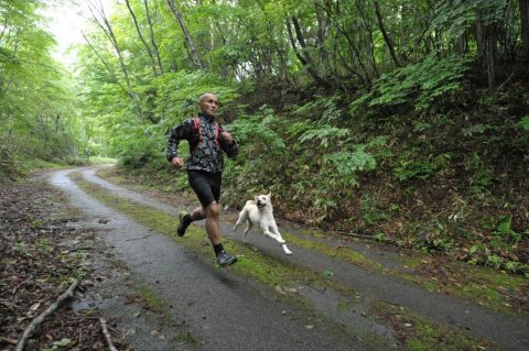 今朝の新甲子温泉は小雨でしたが午前中には雨が上がり晴れ間が広がりました。甲武信ヶ岳で足を傷めていたラブラドールを連れて、国道289号の旧道から甲子峠を経て甲子山までを往復しました。昨日に続いて同行のカメラマンに撮影していただきましたが、トレイルをラブラドールが一緒に走ると新鮮な映像です。