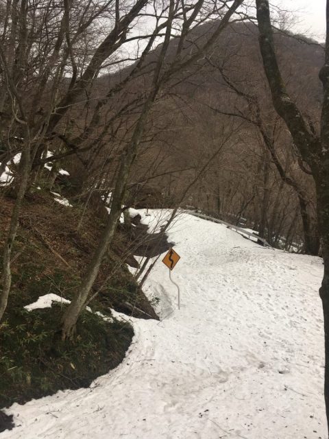 剣桂までの旧道の雪はだいぶとけてアスファルトが露出していますが、沢筋に面して雪が集まる場所にはまだ1メートル以上の積雪があります。