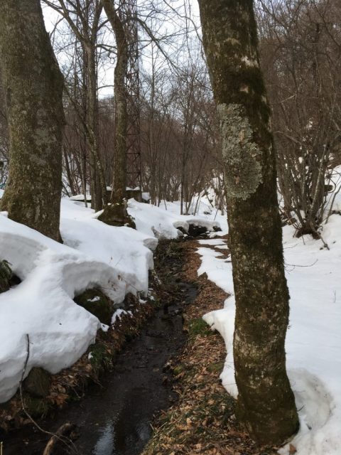 開業までにやるべきことは多く、一人で考え一人で行動することには限界を感じます。「人は一人では生きられない」という言葉が実感を伴ってきました。地元の旅館の先輩経営者からはあせらない方がよいと助言をされていますが、日々時間が無為に過ぎていくようです。こんなときこそマインドフルネスになれる阿武隈源流への散歩が有効で、まだ今の季節はスノーシューを楽しめます。写真は宿が取水をしている剣桂神社の横を流れる沢ですが、かなり雪解けが進みました。