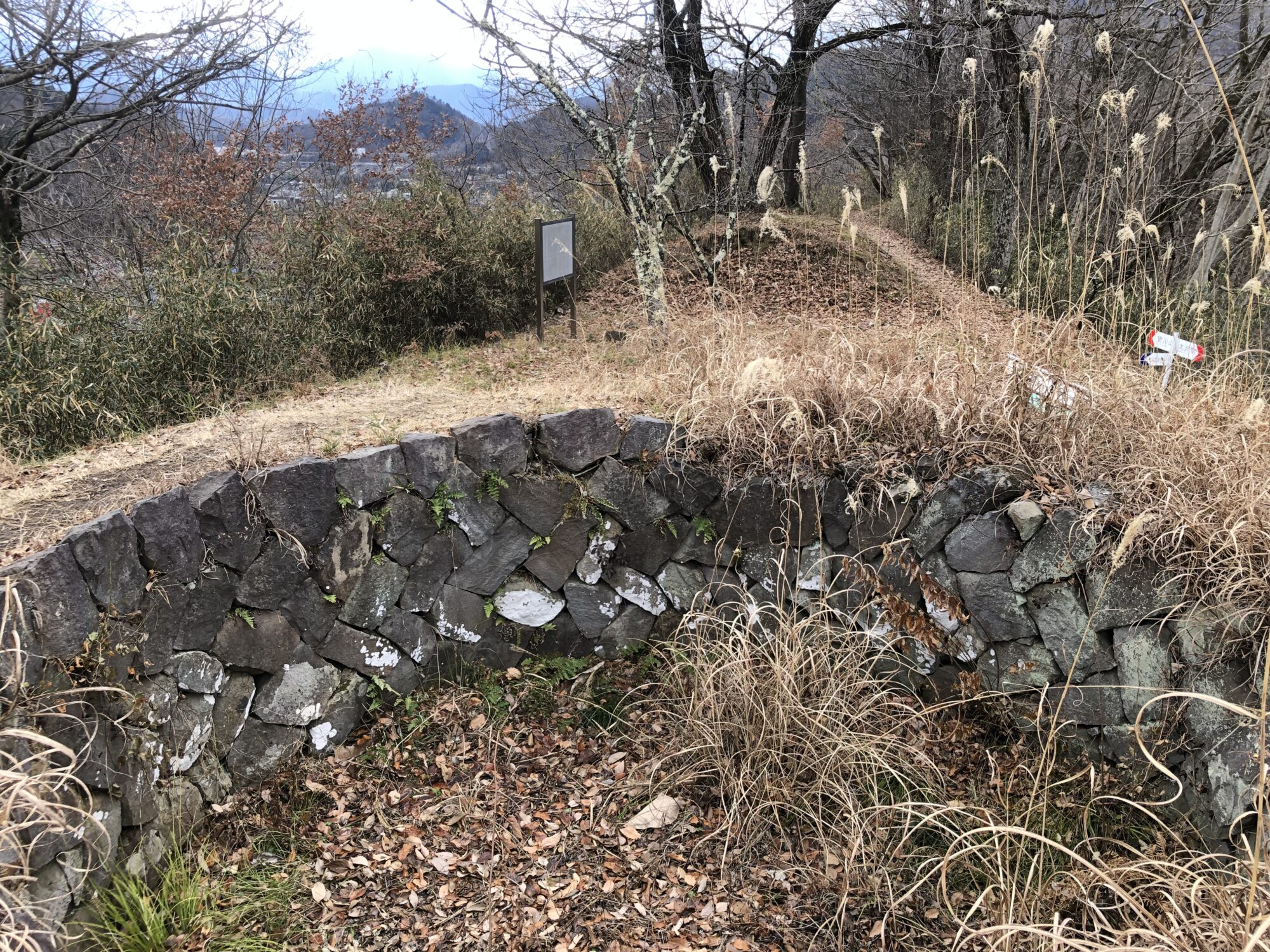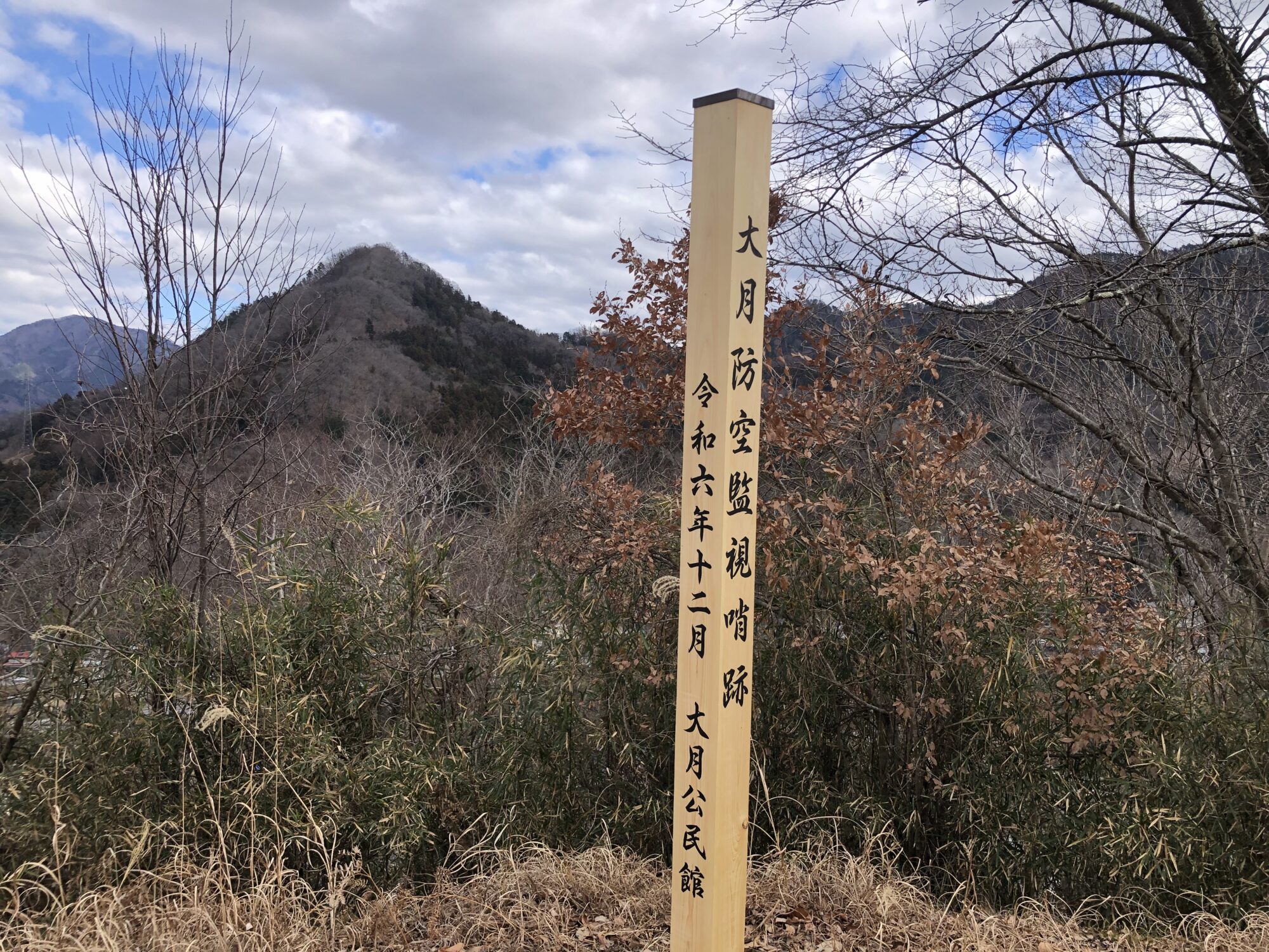 金曜日は大月短期大学の最後の授業があり、以前から行きたかった大月防空監視哨跡に行きました。ここに特別の思い入れがあるのは、かつて自宅の近所にB29が墜落したからです。勿論その痕跡はありませんが、娘が通っていた中学校には、鈍く光る機体の一部が保管されています。富士山を目標に飛来したB29は、大月上空で右旋回し首都圏への空襲に向かい、その最前線が大月と言えます。日中は双眼鏡で監視を行い、夜間は聴音壕内で音から機種を探り警察電話で通報をしたと言います。この情報により空襲警報が発令され、立川にある飛行集団本部が迎撃の判断をしました。自宅の近所に落ちた機体は、1945年3月の東京大空襲を上回る562機もの機数で行われた5月24日未明の空襲で、6基の75mm高射砲が置かれた千歳船橋高射砲陣地からの砲撃による撃墜とされます。聴音壕の石積みは、戦後80年の世界が何も進歩していないことを物語るように見えます。