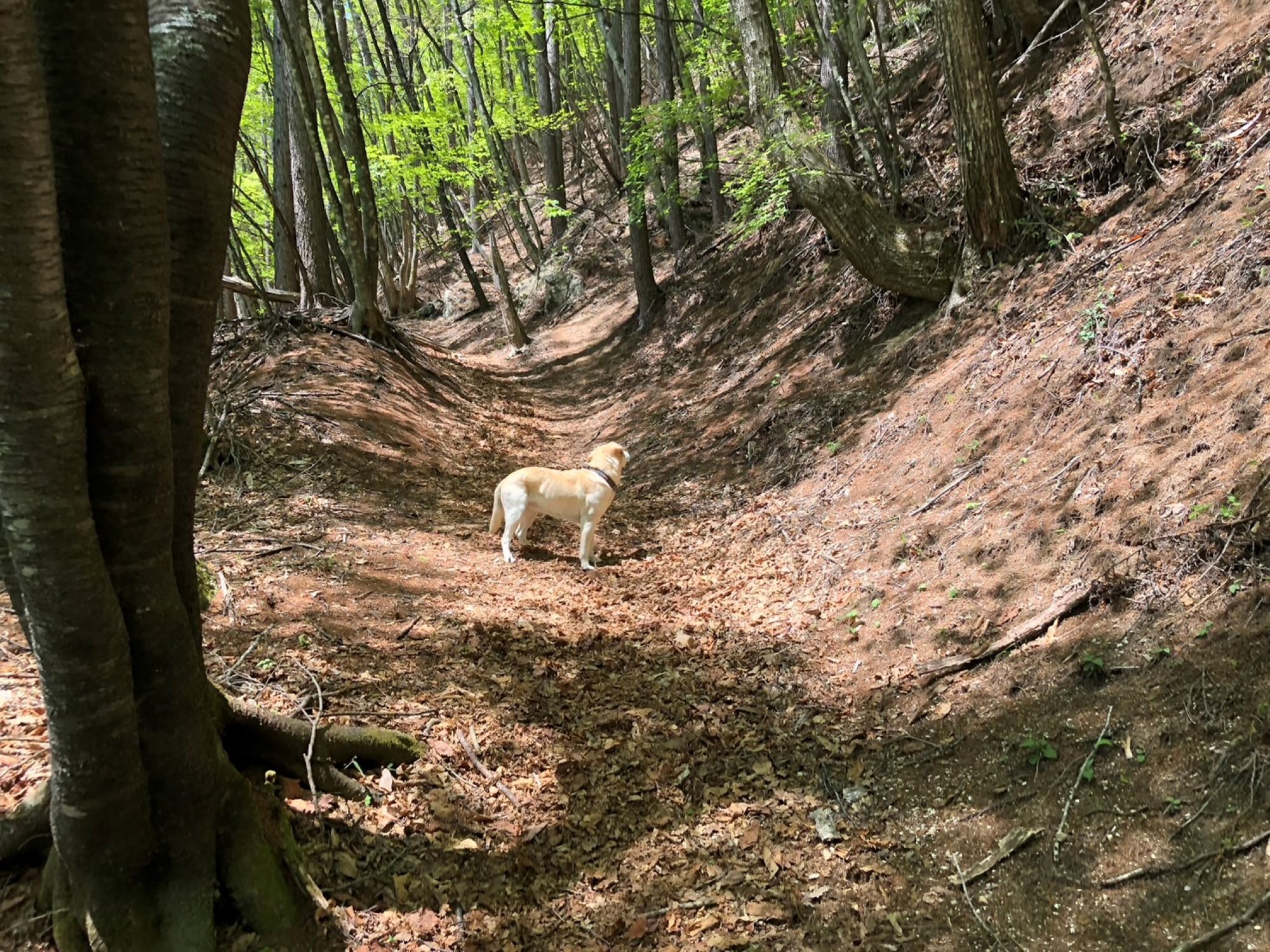 昨日は日の出とともに西岳、編笠山を一人でラウンドしてから、一旦帰宅して白州町の石尊神社からラブラドールと雨乞岳に向かいました。雨乞岳には連休前半にも登り、そのときは標高400m分を車で登れるお手軽なルートでしたが、昨日は雨乞儀式のために古より使われてきた趣ある古道です。長年使いこまれた登山道は美しく、落ち葉が積もる極上トレイルはトレランにも自転車にも最適です。しかし、この道の最良のポイントは誰にも会うことがないために、美しい新緑のなかで厳かな静寂を感じることです。自分と向き合う登山にとって、連休中にも関わらず人と会わない長い登山道は貴重です。最も贅沢な登山とは一人で入る山で、自分のペースを守ることで初めて身体と向き合うことができます。昨日はラブラドールの調子が優れず途中で引き返しましたが、ひたすら自分の身体と対話するために登りたい山です。