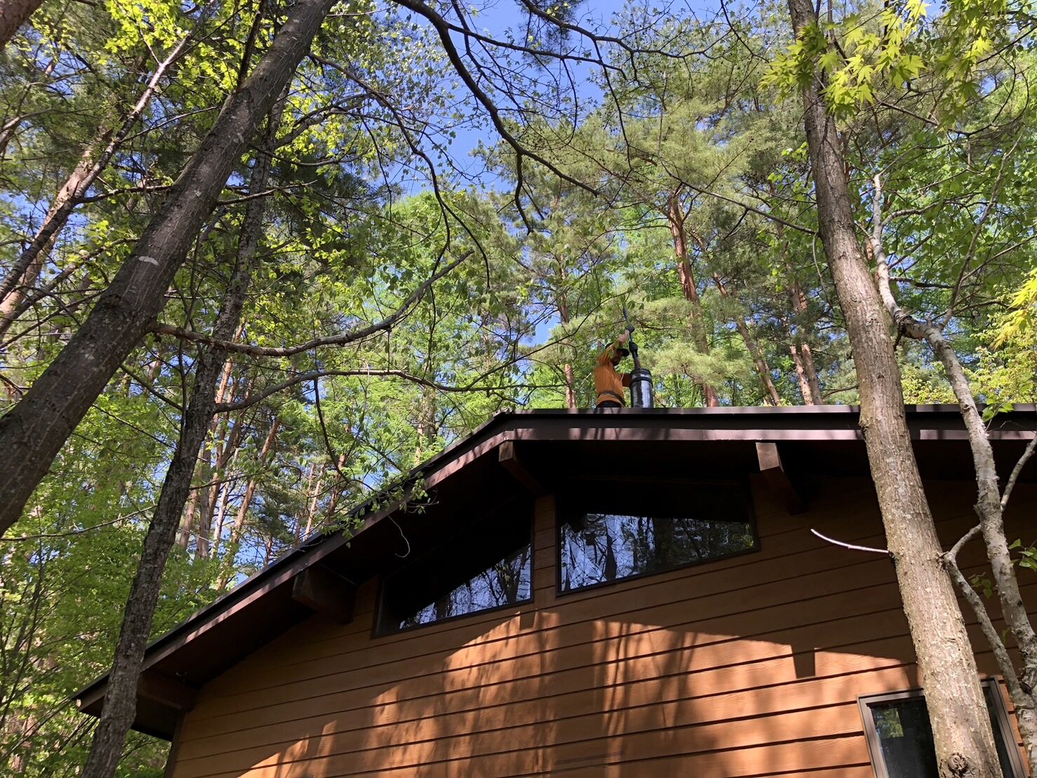 昨日は屋根に積もったカラマツの葉を落としてもらいました。30年ほど放置していた屋根にはタンポポが咲き、小さな木が成長して、葉は良質の土に代わり、屋根の上には虫も住む生態系が出来上がっていました。草屋根は風情があり、断熱効果も期待できるのですが、防根のシートが入っているわけではないので、根が入り込み雨漏りの原因になります。より悲惨なのは薪ストーブの煙突で、こちらも30年放置した結果、水分の多い木を絞った空気で燃やすときに出やすいタールがこびりつき、引火すれば火災になりかねません。ストーブは過不足なく燃えていたので、あまり深刻に考えていませんでしたが、知らないところでリスクが忍び寄っていたことになります。試しにストーブを点けてみると、室内に煙が一切戻ることなく強力に吸い込まれます。慣れとは恐ろしいもので、きっと30年前はこんなに快調だったのでしょう。